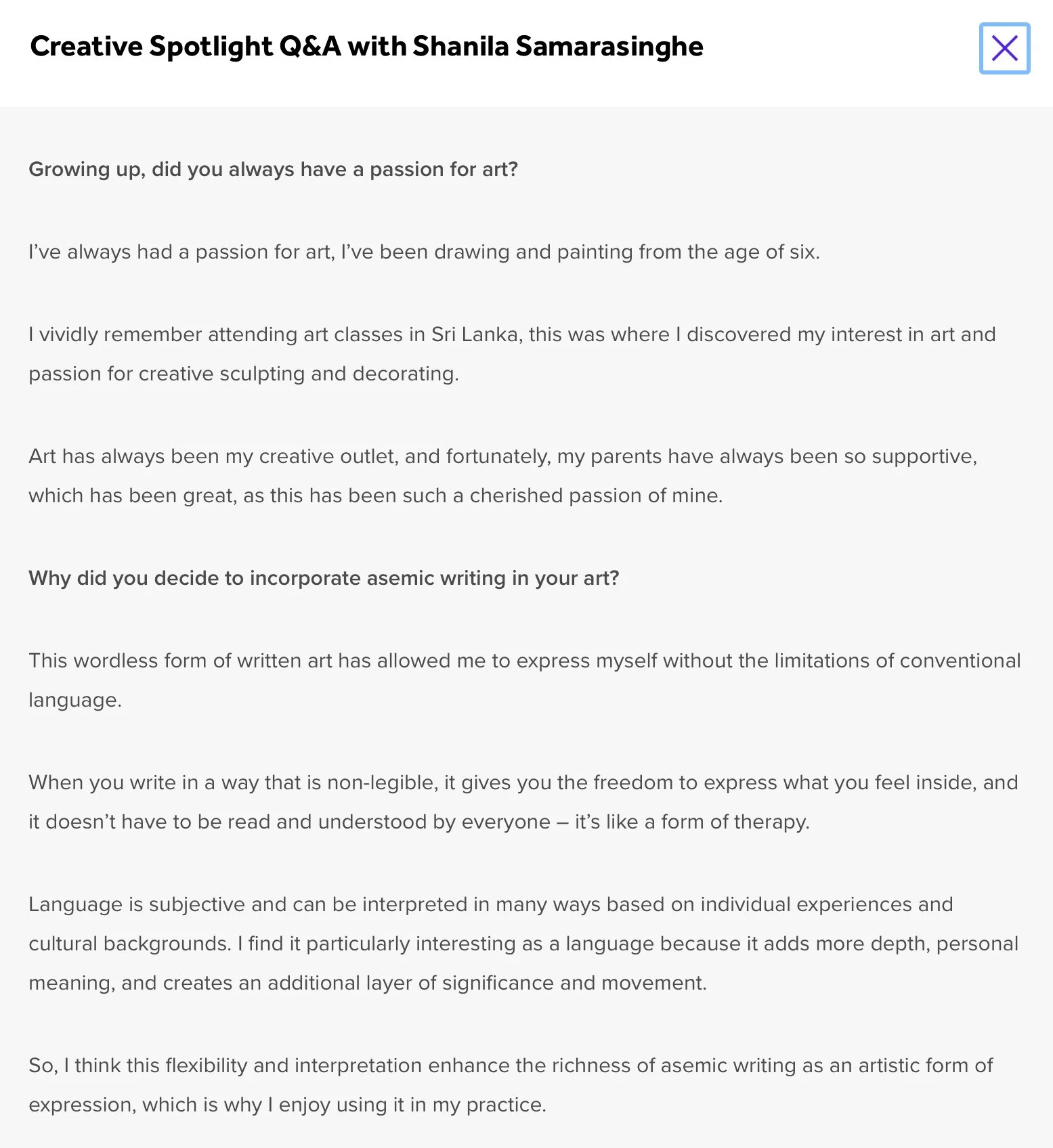 Shanila’s current artistic endeavors incorporate asemic writing, a wordless form of expression that transcends semantic boundaries. This unique approach seamlessly intertwines with the layers and textures in her artistic creations, liberating her from the confines of conventional language rules. Through this primitive yet powerful form of writing, Shanila forges a distinctive artistic language that resonates beyond mere words, creating a singular and authentic self-expression.