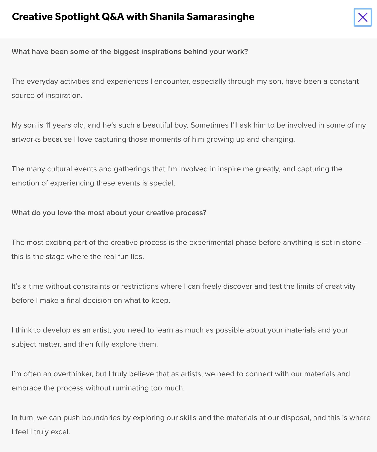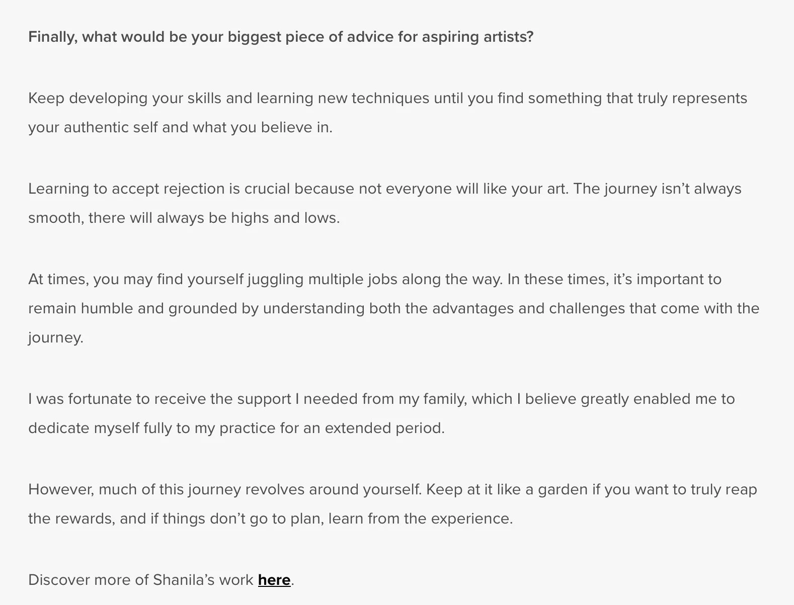 Shanila’s passion for art, her diverse experiences, and her commitment to creativity make her a remarkable artist and educator.